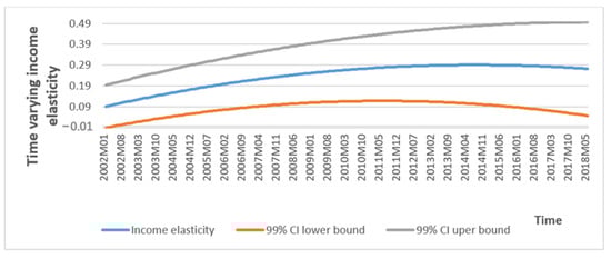 As a next step, the estimated elasticities need to be tested to see whether they are time varying. That is, the joint significance of the coefficients of polynomials and trigonometric functions should be tested. The results of the TVC’s significance tests are presented in Panel B of Table 3. As can be seen from the table, the test statistics is greater than the critical values for any significance level. Hence, we conclude that the coefficient of income is time varying. The long-run estimations results are given in Table 4, and the time-varying income elasticity is depicted, with 99% confidence interval bands, in Figure 3. The estimated long-run income elasticity ranges from 0.10 to 0.29, while the long-run price elasticity is −0.15.