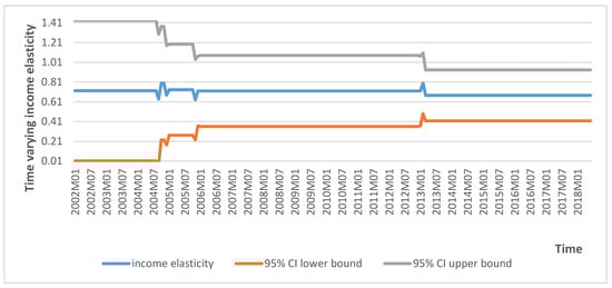 The income elasticity is depicted in Figure 5, with 95% confidence interval bands. The general behavior of all three elasticities found is similar, increasing at the beginning of the sample (up to around 2013–2014 in all three cases) and slightly declining close to the end.