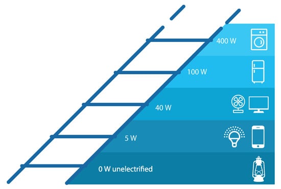 The electricity demand of a user increases with time, a phenomenon well captured in the literature in the past [15,16]. This phenomenon can be visualized in the form of the so-called energy ladder, as referred to in the literature before [17]. Specifically in the context of electrification, it is also referred to as the electrification ladder [15,18]. Figure 1 illustrates the concept of the electrification ladder. At the lowest rung is an unelectrified household with no access to electricity, represented by a fossil-based fuel source (e.g., kerosene lamp). Higher rungs of the ladder represent the increase in the number of appliances, and therefore, the overall electricity demand.