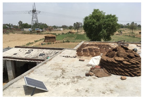 Fieldwork carried out in 2017 in India also highlighted the complex issues at the grass-roots level related to the limitations of national grid outreach [24]. Figure 2 depicts a “powerful” image; it captures the harsh reality of electricity access for a rural household in a state in Northern India. A single solar panel can be seen on the rooftop that also has cow dung cakes drying in the sun, which will be used as cooking fuel once dried. Making up the powerful irony in the picture are the grid lines passing tantalizingly close to the house, which had no grid-based electricity access until 2017 despite the presence of the grid in the region for several years.