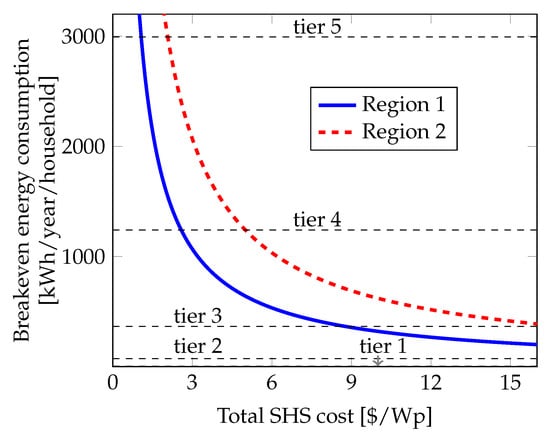 Illustrative breakeven annual consumption as a function of SHS upfront costs for two different regions (adapted from [25]). The different tier consumptions of the MTF are also marked for reference. Tier 1 is not clearly visible given the scale of the y-axis, as the annual energy consumption for tier 1 level is merely 4.38 kWh.