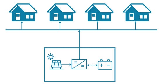 An example of a centralized microgrid architecture is shown in Figure 5. The term centralized refers to the central power generation and storage, which is shown in Figure 5 in the form of solar PV and battery storage. Additionally, given the recent proliferation of the so-called super-efficient DC appliances [28], the microgrid depicted in Figure 5 assumes a DC architecture.