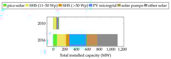 Capacity of different installed off-grid solar energy sources including SHS, pico-solar, solar PV minigrids, solar pumps, and other uncategorized off-grid solar PV applications (data from [31]).