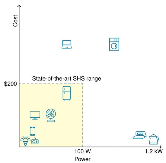 State-of-the-art SHS are usually limited to 100 Wp. This leads to a paradoxical predicament as shown in the conceptual illustration in Figure 10, which maps the appliance costs versus power rating space. The highlighted region represents the range of the typical SHS in terms of power delivery and the usual DC appliances used in such an SHS. These appliances are the so-called super-efficient DC appliances.