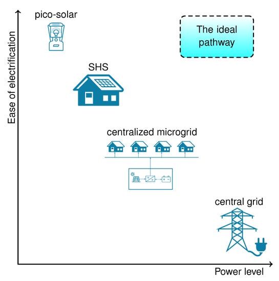 The ideal electrification pathway is represented in Figure 12 in the top right corner; it can provide rapid electrification while catering to ‘on demand’ power consumption commensurate with higher tiers of electricity consumption. This solution has to be as easy for rapid adoption as SHS while addressing the current shortcomings plaguing SHS from becoming a truly sustainable electrification solution. The requirements from such an ideal off-grid solar solution that can overcome the issues mentioned in Section 5 can be listed as follows.