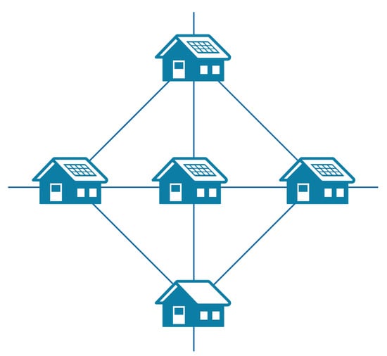 Conceptual illustration of a bottom-up, scalable, interconnected SHS-based meshed DC microgrid [32]. The bottom house is shown without any SHS, indicating the possibility of purely consumptive houses joining such a microgrid.