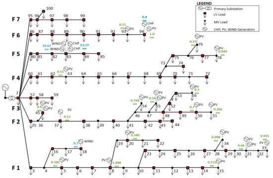 The procedure was applied to a test distribution network derived from the ATLANTIDE project [32]. The MV network, shown in Figure 1, representative of the industrial ambit, was constituted by 100 nodes, subdivided in seven feeders supplied by a primary substation equipped with a 25 MVA high voltage/medium voltage (HV/MV) transformer. The total demand was about 30 MVA (372 GWh/year) and the total installed DG capacity was 34 MW (27.2 GWh/year), as a mix of wind, PV and biomass CHP generators.