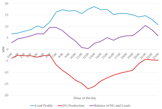 The load profiles indicated a peak load of 18.69 MW during the spring working day and 18.14 MW during the summer working day with an average load of 13.79 MW and 13.38 MW, respectively. As an example, the demand and production profiles and their balance at the HV/MV interface, during the spring working day, are shown in Figure 2.