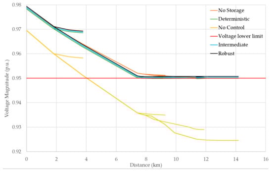 Voltage profiles of feeder F1 for no control, no storage (certain deterministic optimal power flow (OPF) without storage) and deterministic (certain deterministic OPF with storage), intermediate and robust cases at 9:00 am of the winter working day.