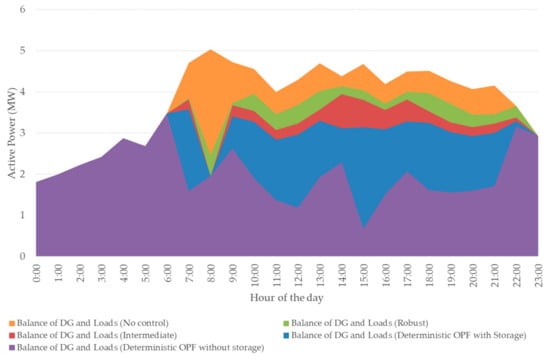 For the sake of a comprehensive view, in the following, the results obtained by the application of the described optimization to the network of Figure 1 in 12 typical days, differentiated between working days, Saturdays, and holidays (Sundays included), and between seasons, have been reported. The time horizon of 24 h of each typical day has been considered with a time step of 1 h. Three scenarios have been considered: the certain one (solved by the deterministic OPF) and two uncertain scenarios with different values of risk ( and ), both solved with RO. Furthermore, for highlighting the advantages provided by the storage systems the case of deterministic optimization (certain) without storage has been added to the previously described cases.
