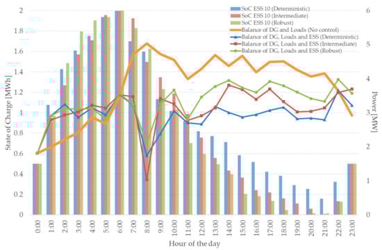Furthermore, it can be observed in Figure 6 that the ESS located around bus 10 in the feeder F1 has a similar trend of the same ESS in the deterministic case: it charges and discharges mostly in the same hours for solving local contingencies. In particular, it charges when the load demand is low (at the first hours of the day), and finally, at the end of the day for recovering their initial SoC; on the contrary, it discharges in correspondence of the peaks of demand (7:00–21:00).