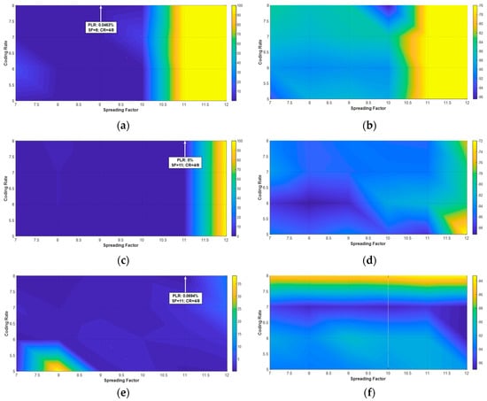 The papers [44,45,46,47] analysed the different configuration parameters: the carrier frequency (CF), SF, BW, and CR in a LoRA network. The combination of these parameters provides different energy values and transmission ranges: