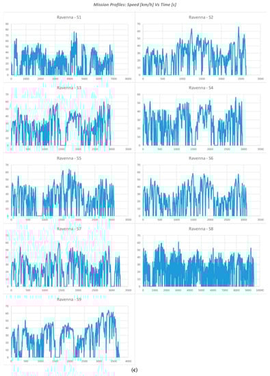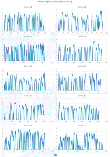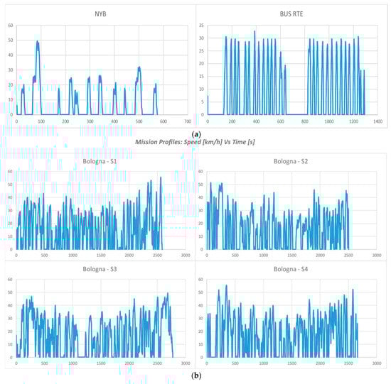 (a) NYB (“New York Bus”) and BUS RTE (bus mission measured in Denver-USA) mission profiles, (b) “Bologna” mission profiles, (c) “Ravenna” mission profiles and (d) “Torino” mission profiles.