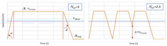 To make the reconstructed cycle equivalent to that foreseeable in real operations, both from a kinematic and from an energetic point of view, it is therefore necessary to add accelerations and decelerations capable of simulating, at least in overall terms, the energy characteristics of the cycle in question. To this end, a parameter has been defined, Nad (i.e., the number of overall accelerations and decelerations in the average arc), which can also assume non-integer values. Once Nad is fixed, the equivalent cycle can be reconstructed according to the diagram shown on the right side of Figure 2. This novel “quasi-trapezoid” cycle is a generalization version of the simple trapezoidal one, obtainable for Nad = 1.