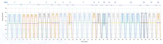 Proceeding iteratively in the same way for the sixteen mission arcs, sixteen “quasi-trapezoid” energy-equivalent arc mission profiles can be reconstructed. The succession of the 16 arches will therefore represent the overall mission equivalent to the cinematic- and energetic-equivalent to the service to be performed based on the programming plan set for Line 90 of Rome (specifically for the first morning service of the vehicle). The resulting mission is represented in Figure 3. Figure 3 also reports the mean cruise speeds of each one of the 16 mission arcs.