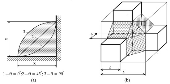 Figure 1a shows the distribution of a very small amount of water in the form of a membrane with a constant cross-section in the corner formed by two perpendicular half-planes at different values of the contact angle. If we adopt the average cell size of polyurethane foam given in [5], it can be assumed that the dimension, x, in Figure 1a does not exceed 200 μm. In this case, in normal conditions, gravity is not able to distort the surface of the liquid shown in Figure 1a because its value does not exceed 0.5% of the surface tension value. Therefore, it is easy to present the distribution of liquid in the unit cell. As an example, Figure 1b shows an eighth part of the unit cell containing insulated inclusion of water at the contact angle of 45°.