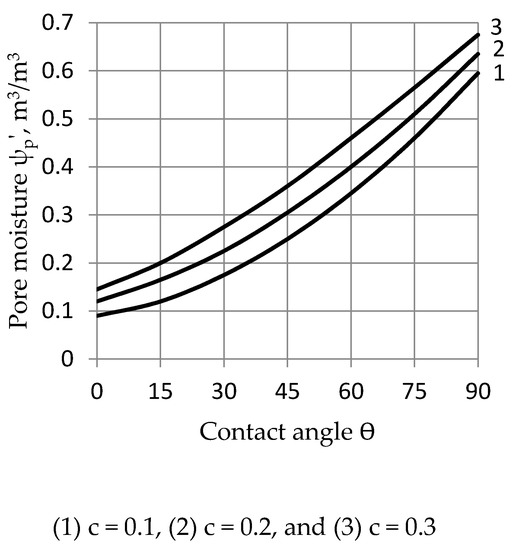 Equations (1)–(3) determine the dependence between the boundary pore moisture content, , and the contact angle, ϴ, for different values of the relative size of bars c = Δ/L. Such dependence is shown in Figure 2. The relative size of bars is calculated using the following equation [15]: