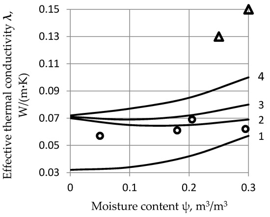 From the comparison of the Dependence 1 in Figure 3 with the other dependencies it follows that the diffusion component of the thermal conductivity, λv, is different for various ways of taking into account thermal conductivity, λ, of moist polymer. Using Equation (12) to determine the vapor diffusion resistance coefficient, µ, instead of Equation (15) resulted in significant differences (qualitative and quantitative) while determining the effective thermal conductivity, λ (Curves 3 and 4).