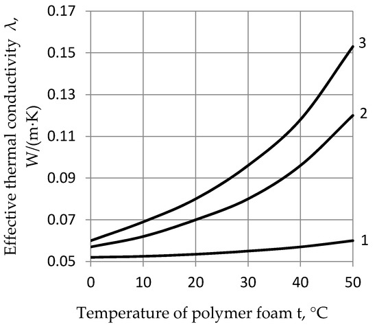 Finally, using Equation (5) for the structure with equivalent, interpenetrating components, we determine the effective thermal conductivity, λ, of moist polymer foam. The first component to be considered is the pore substance, for which we have m1 = m = 0.93, λ1 = λ12 = 0.0608 W/(m·K) and the parameter c = 0.8386, determined from Equation (4). The second component, the polymer skeleton, is characterized by the values m2 = 0.07 and λ2 = 0.25 W/(m·K). Then, we have the ratio ν = λ2/λ1 = 0.25/0.0608 = 4.1118. After we obtain the values of the parameters, c and ν, from Equation (5), we determine the effective thermal conductivity of polymer foam λ = 0.068 W/(m·K).