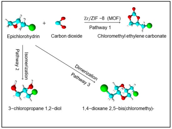 The coupling reaction of CO2 with epoxides can be initiated by activating either the epoxide or CO2 or both at the same time [22]. This reaction, using a suitable heterogeneous catalyst, produces desired organic carbonates along with other side products. Figure 1 shows reaction pathways 1, 2, and 3 with corresponding products being chloromethyl ethylene carbonate, 3-chloropropane 1,2-diol, and 2,5-bis (chloromethyl)-1,4-dioxane respectively. The epoxide is activated when the oxygen atom interacts with the Lewis acid, this is then followed by a nucleophilic attack that provokes the opening of the epoxide ring [23] as shown in Figure 2. The activation of CO2 can occur both through a nucleophilic attack with the oxygen atom as a nucleophile or an electrophilic attack with the carbon atom as an electrophile [24]. Figure 2 shows a proposed reaction mechanism for the synthesis of CMEC, where R is an alkyl group, A is a metal atom with a Lewis acid site, while B is an oxygen atom with a Lewis basic site. Zr/ZIF-8 is a dual-functional catalyst, which contains both the acidic and basic sites that are associated with the Lewis acid Zn2+ ions and the basic imidazole groups, respectively. The by-products identified with the coupling reaction of CO2 and ECH as identified by the GC analysis are 3-chloropropane 1,2-diol and 2,5-bis (chloromethyl)-1,4-dioxane (see Figure 1). Figure 3 shows the schematic representation of the reaction of CO2 and ECH to produce CMEC.