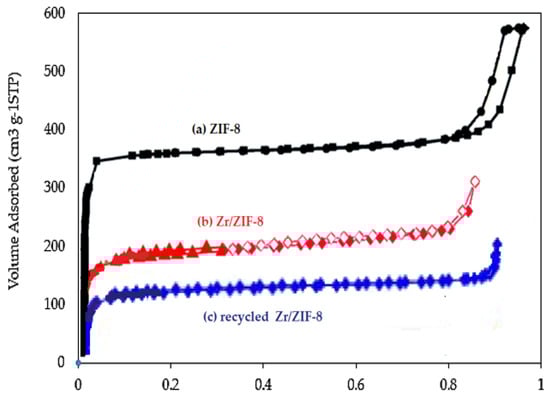 N2 adsorption–desorption isotherms of (a) ZIF-8, (b) Zr/ZIF-8, and (c) recycled Zr/ZIF-8 synthesized with 10% dopant of Zr.