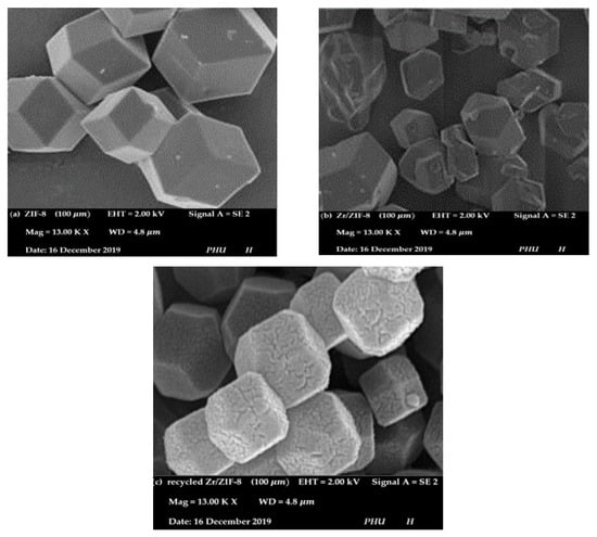 Scanning Electron Microscope (SEM) images of (a) ZIF-8 crystals, (b) Zr/ZIF-8, and (c) recycled Zr/ZIF-8 crystals synthesized with 10% dopant of Zr.