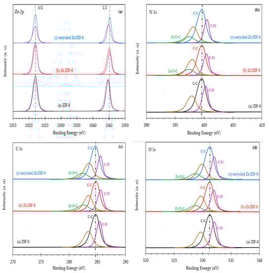 X-ray photoelectron spectroscopy (XPS) spectra showing deconvoluted regions of ZIF-8, Zr/ZIF-8 catalyst, and recycled Zr/ZIF-8 catalysts. (a) Zn 2p, (b) N 1s, (c) C 1s, (d) O 1s.