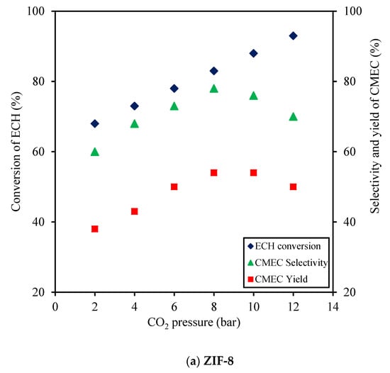 The selectivity and yield of CMEC was found to increase steadily from 67% and 58% to 86% and 76%, respectively, as the CO2 pressure increases from 2 to 8 bar. These results indicate that the catalytic performance of the Zr/ZIF-8 depends on the concentration of available CO2 at the reactive sites. Similar variation was observed in the catalytic activity of the two frameworks with changing CO2 pressure where the selectivity and yield of CMEC increased from 57% and 37% to 77% and 52%, respectively, at the same pressure of 8 bar of CO2 as in the case of Zr/ZIF-8.