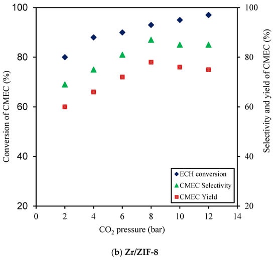 In addition to the effect of temperature on catalysts’ selectivities, the influence of varying CO2 pressure on catalysts’ selectivities was also investigated. According to Figure 14a,b, the selectivity of the catalysts towards CMEC was found to increase steadily from 67% and 58% to 86% and 76%, respectively, as the CO2 pressure was increased from 2 to 8 bar. These results indicates that the activity and selectivity of both catalysts were influenced by the concentration of available CO2 at the reactive sites. Although, similar effect was observed in the responses of both catalysts to variation in CO2 pressure, however, the results show that Zr/ZIF-8 has higher selectivity than the ZIF-8 catalyst, where the selectivity of both catalysts increased from 69% and 60% to 87% and 77%, respectively, for Zr/ZIF-8 and ZIF-8catalysts. Concersely, both samples experienced decline in selectivities from 87% and 77% to 85% and 70% for ZIF-8 and Zr/ZIF-8, respectively, when the CO2 pressure was increased beyond the optimum level of 8 Bar.