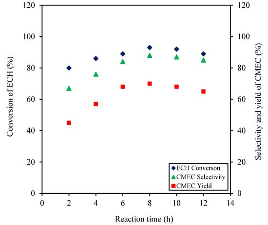 Figure 14 demonstrates the dependence of CO2 pressure on the yield of CMEC. It can be observed from the graph that the CMEC yield increased with increasing pressure, the maximum of the CMEC yield was reached at 8 bar. By increasing the CO2 pressure more than 8 bar, a negative effect was observed on both reaction systems, where both yield and conversion experience a slight drop. Wang et al. [60] observed that the introduction of too much CO2 dissolves in epoxide may result in the formation of CO2-epoxide complex, and retards the interaction resulting in a lower conversion. Similar results were also reported by Onyenkeadi et al. [61], where the introduction of higher pressure of CO2 dissolved in the epoxide and becomes an unfavorable factor due to the difficulty of separating CO2 and ECH. This condition inhibits the reaction between ECH and catalyst, thus resulting in lower yield [62]. Liang et al. [63] also reported that many diols and dimers of epichlorohydrin were produced as side products at high pressure. Based on the experimental results and theoretical study, it can be concluded that 8 bar CO2 pressure was the optimum and all subsequent experiments for the CMEC synthesis were carried out at a CO2 pressure of 8 bar.