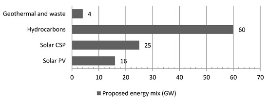 The Kingdom of Saudi Arabia (KSA) is producing large volumes of oil but most of it is being consumed in the country for power production. To meet the rising demands of electricity the kingdom plans to increase the electricity generating capacity to 120 GW by 2032 [11,12]. In 2013, the country was generating about 292.2 billion kWh of electricity [13]. The energy demand is increasing at a high pace due to the population growth, materialistic living standards, industrialization, high demand for cooling due to hot and humid conditions, and subsidized electricity rates. The electricity demand in the country has increased at an average rate of about 8.2% in the last decade [14]. The kingdom has different expansion plans for energy production from renewable sources [15]. The institution responsible for renewable energy in the country (King Abdullah City for Atomic and Renewable Energy K.A. CARE) set a target of generating 24 GW by 2020 and 54 GW by 2032 from renewable energy [16,17]. The overall proposed energy mix of the country is shown in Figure 3. Furthermore, the country has planned an expansion of about 25–41 GW concentrated solar power (CSP) and 16 GW of PV capacity until 2040 to meet increasing energy demands through nonhydrocarbon sources [18,19]. Furthermore, a great deal of research work has been carried out for renewable and energy-efficient technologies at leading institutions of the country.