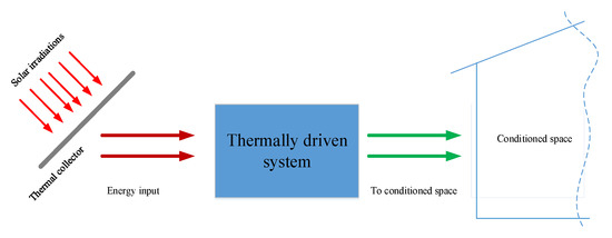 Due to the direct and efficient use of solar energy, solar thermal-driven air conditioning systems such as absorption, adsorption, and desiccant are getting more attention. A typical solar thermal cooling system consists of solar collectors, a thermally driven cooling machine, and some other accessories such as storage tank, pump, etc. The basic concept of a solar thermal air conditioning system is shown in Figure 4.