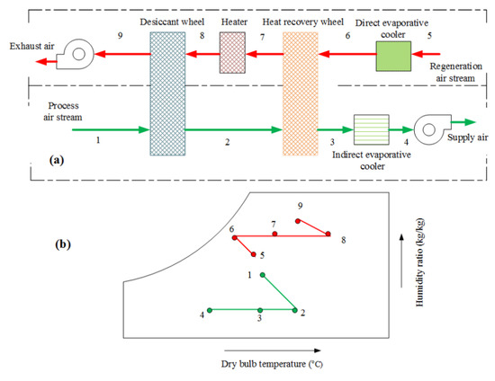 The desiccant cooling system operating under the ventilation cycle is shown in Figure 5. The desiccant wheel adsorbs the moisture from process air (stage 1–2) which is then passed through a heat recovery wheel (stage 2–3) for the exchange of heat between the hot and dry process air and cold regeneration air. A desiccant wheel is a mass and heat exchange device having low rotational speed. The desiccant material is embedded into the wheel using a matrix of supporting material forming a number of flow channels. The wheel is divided into two sections, i.e., process and regeneration. On the process side, the moisture is adsorbed from the air passing through the desiccant surface. In the regeneration section, adsorbed moisture is removed using a high-temperature regeneration air stream. The flow rate of process and regeneration air is very important at this stage for heat recovery and system overall efficiency. After the heat recovery, the processed air is cooled to the desired temperature (stage 3–4) using an evaporative cooler. The desiccant wheel is regenerated using heated air. The heat energy is provided using solar thermal collectors in the real system. A specific regeneration temperature is assumed for the regeneration of desiccant material.