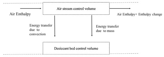 On the process side, energy is transferred between the air and desiccant surface by convective heat and mass transfer.