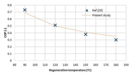 The model was verified by comparing the results obtained from the present model with that of reference [20] for the effect of regeneration temperature on the COP of the system. The analysis was carried out under the same operating condition as used in reference [20] and using climatic data for Dhahran. The regeneration temperature varied from 90 to 180 °C to observe its effect on system performance. The comparative results are shown in Figure 8. It is observed that the COP value obtained using the present model is in good agreement with that of reference [20] for the climatic conditions of Dhahran. The COP is underpredicted by ~5% when a lower regeneration temperature (90 °C) is used for activation of the desiccant wheel whereas COP is overpredicted by ~10% when a regeneration temperature is kept in the higher range (180 °C). It is further observed that, as the regeneration temperature increased, the COP of the system decreased. The decrease in the system COP due to an increase in the regeneration temperature is due to the increase in required regeneration heat. Although the higher value of regeneration temperature will make the moisture removal process faster, at the same time this higher value of temperature will dry-up the desiccant wheel before the completion of the regeneration period. Hence, some added energy will be wasted and will not be utilized during moisture removal. Thus, the increase in regeneration temperature will increase the required regeneration heat, which, in turn, will decrease the COP of the system.