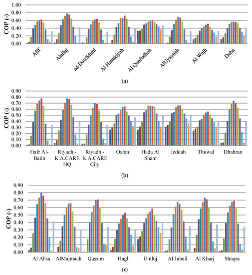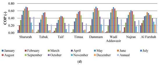 Monthly variations of coefficient of performance for (a) Afīf, Alaflaj, ad-Dawādimī, Al Hanakiyah, Al Qunfudhah, AlUyaynah, and Al Wejh, Duba; (b) Hafr Al-Batin, Riyadh—K.A. CARE HQ, Riyadh—K.A. CARE City, Osfan, Hada Al Sham, Jeddah, Thuwal, and Dhahran; (c) Al Ahsa, AlMajmaah, Qassim, Hagl, Umluj, Al Jubail, Al Kharj, Shaqra; (d) Sharurah, Tabuk, Taif, Timaa, Dammam, Wadi Addawasir, Najran, and Al Farshah.