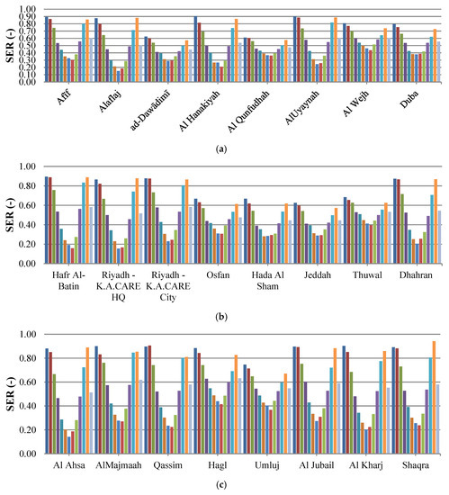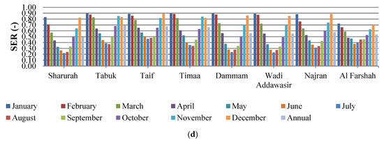 The sensible energy ratio (SER) is another important performance parameter that defines the additional cooling required to provide thermal comfort conditions. The variation of SER for all the sites is illustrated in Figure 10. As the humidity ratio of the air at the inlet of the desiccant wheel increases, a greater amount of water vapor is adsorbed by the desiccant wheel which increases the released heat of adsorption. This increase in adsorption heat causes an increase in the temperature at the exit of the desiccant wheel. At constant inlet air and regeneration temperature, the increase in temperature at the exit of the desiccant wheel causes a decrease in SER. Thus, with the increase in the inlet humidity ratio, SER increases. The increase in the temperature at the inlet of the desiccant wheel slightly reduces the water removal from the process air. This decreases the heat of adoration and the temperature at the exit of the desiccant wheel also lowers. In general, higher values of SER are observed in the wintertime and lower from May to September at almost all the sites investigated in the present work. With respect to site comparison, the highest value of SER of 0.94 was obtained in the month of December for Al Shaqra and the lowest of 0.14 in July for Al Ahsa. The annual average performance was highest for Tabuk with a SER value of 0.69 and the lowest of 0.44 for Hada Al Sham.
