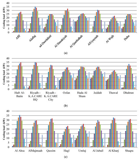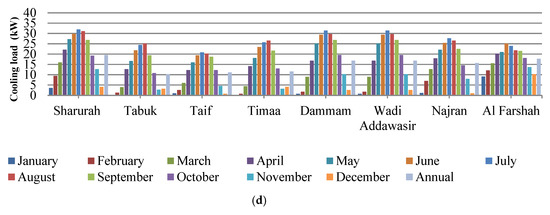 Monthly variations of cooling load for (a) Afīf, Alaflaj, ad-Dawādimī, Al Hanakiyah, Al Qunfudhah, AlUyaynah, and Al Wejh, Duba; (b) Hafr Al-Batin, Riyadh—K.A. CARE HQ, Riyadh—K.A. CARE City, Osfan, Hada Al Sham, Jeddah, Thuwal, and Dhahran; (c) Al Ahsa, AlMajmaah, Qassim, Hagl, Umluj, Al Jubail, Al Kharj, Shaqra; (d) Sharurah, Tabuk, Taif, Timaa, Dammam, Wadi Addawasir, Najran, and Al Farshah.