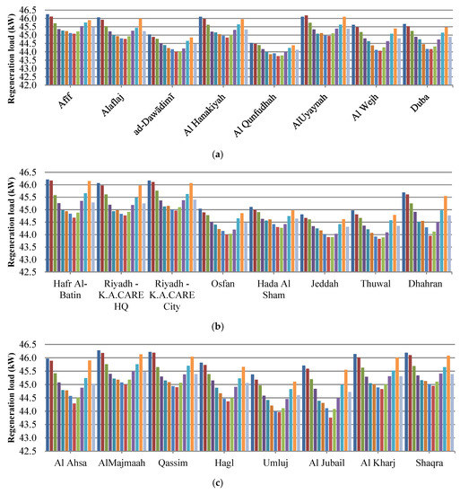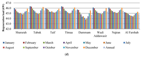 Monthly variations of regeneration load for (a) Afīf, Alaflaj, ad-Dawādimī, Al Hanakiyah, Al Qunfudhah, AlUyaynah, and Al Wejh, Duba; (b) Hafr Al-Batin, Riyadh—K.A. CARE HQ, Riyadh—K.A. CARE City, Osfan, Hada Al Sham, Jeddah, Thuwal, and Dhahran; (c) Al Ahsa, AlMajmaah, Qassim, Hagl, Umluj, Al Jubail, Al Kharj, Shaqra; (d) Sharurah, Tabuk, Taif, Timaa, Dammam, Wadi Addawasir, Najran, and Al Farshah.