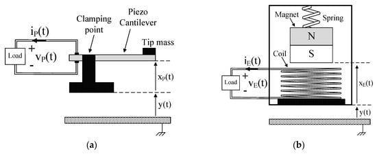 As shown in Figure 2a, in a P-RVEH a piezoelectric cantilever is clamped to a support to which vibrations are applied. The tip of the cantilever (where a mass is attached) moves out of phase with respect to the support. Therefore, there is a relative displacement xP(t) between the tip of the cantilever and the clamping point leading to the generation of electric energy. As shown in Figure 2b, in an E-RVEH a permanent magnet is connected to a spring and, due to vibrations, it moves out of phase with respect to the generator housing to which a coil is fixed. The relative displacement xE(t) taking place between the magnet and the coil gives rise to the conversion of mechanical energy into electric energy.