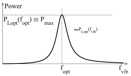 In Figure 5, the typical trend that is exhibited by the maximum load powers of a P-RVEH and of an E-RVEH vs. the vibration frequency (fvib) is reported. The unique symbol PLopt is used in Figure 5 for the maximum load power of both types of RVEHs.