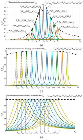 Typical trends vs. the normalized vibration frequency of the powers provided to the load by a RVEH (P-RVEH or E-RVEH) with the application of: (a) ETT, (b) MTT, (c) both ETT and MTT.