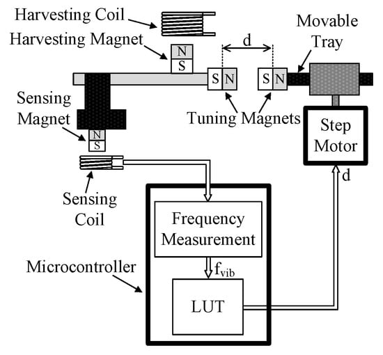 In [8,9], this type of MTT is applied to a MEMS-scale E-RVEH. As shown in Figure 8, the electromagnetic harvesting mechanism is obtained by positioning a spring-supported magnet (harvesting magnet) above a coil. A second magnet (tuning magnet) is placed at an appropriate height from the harvesting one so that a repulsive force takes place between the harvesting and tuning magnets. The distance between the tuning and harvesting magnets is manually adjusted by means of a screw mechanism.
