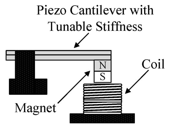 In [21,22], an E-RVEH adopting a piezoelectric actuators based MTT is presented (Figure 11). The vibrating structure is composed by two piezoelectric layers that are used as a unique cantilever with a tunable stiffness. A magnet is placed at the tip of such a cantilever structure and it oscillates with respect to a fixed coil. The E-RVEH has an untuned resonance frequency equal to 299 Hz. It is important to highlight that, when the vibrations’ frequency is equal to such an untuned resonance frequency, the piezoelectric cantilever does not need to be tuned and hence it is possible to extract energy both from the coil and also from the piezoelectric layers. When instead the frequency of vibrations is different from the untuned resonance frequency, an electric voltage needs to be applied to the piezoelectric layers which draw power and hence energy can be extracted only from the coil. In [21,22], the voltage signal applied to the piezoelectric layers is manually regulated. A tuning period that, theoretically, should provide a net power extraction is estimated to be equal to 20 s.