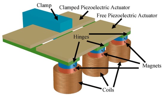 Moreover, in [23], a piezoelectric actuators based MTT is applied to an E-RVEH. A phase shift control circuit is proposed for a closed-loop control of the resonance frequency. The used tunable E-RVEH was introduced in [24]. Two piezoelectric actuators, a clamped one and a free one, are connected together with three small hinges, as shown in Figure 12. The stiffness of the structure can be changed by applying an electrical voltage to the piezoelectric actuators. Three small magnets are fixed on the free ends of the three hinges to induce voltages into three coils fixed on the ground plate. The system presented in [23] is able to automatically regulate its resonance frequency by means of phase shift conditions (at resonance the phase shift between excitation displacement and swinging beam displacement is −90°). The phase of the beam is measured using the output signal of the harvester. Instead, an additional sensor is fixed at the clamp to measure the phase of the excitation. Even if in [23] no tuning period is provided, it can be calculated by considering that the power needed for the discrete control circuit is around 150 mW while the harvested power is equal to 1.4 mW.