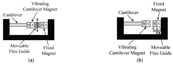 Magnetic forces based MTTs rely on the interaction among magnets with the aim of altering the stiffness of a RVEH, thus changing its mechanical resonance frequency [7,8,9,10,11,12,13,14,15,16,17,18,19,20]. Usually two magnets are used, one is part of the oscillating mass and the other is movable. The displacement of the movable magnet can be obtained by means of a human operator, in the case of manual MTTs, or by means of an actuator, in the case of automatic techniques. The force exerted by the movable magnet on the oscillating one varies as a function of their distance and is used in order to tune the resonance frequency. Obviously the two magnets can be placed so that their forces are attractive or repulsive. It is clear that, by definition, this type of MTT is mechanically implemented because it basically acts on a mechanical quantity that is the distance between the magnets. Moreover, it can be applied to both P-RVEHs and E-RVEHs. To the best of the authors’ knowledge, this type of MTT is the most exploited and discussed in the literature of the last years. However, it is important to underline that, at the moment, there is not a way to theoretically predict the resonance frequency obtained as a function of the distance of the magnets. In fact, there is always the need of an experimental precharacterization of the system in order to be able to estimate the obtainable resonance frequency. In the following, the main magnetic forces based MTTs are discussed [7,8,9,10,11,12,13]. Additional magnetic forces based MTTs [14,15,16,17,18,19,20] are reported in the Reference Section without a specific description since their working principles are very similar to the ones described in this Section.