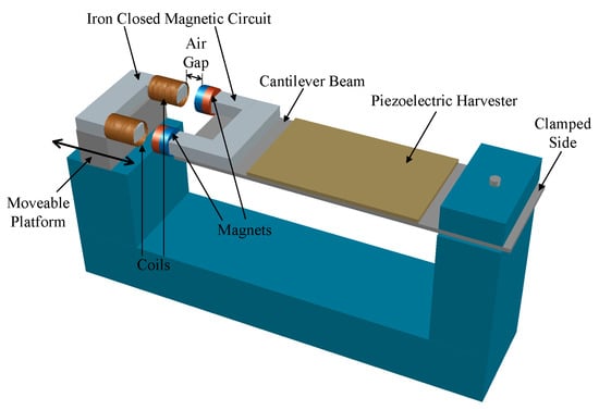 - Xia, H.; Chen, R.; Ren, L. Parameter tuning of piezoelectric–electromagnetic hybrid vibration energy harvester by magnetic force: Modeling and experiment. Sens. Actuators A Phys. 2017, 257, 73–83. [Google Scholar] [CrossRef]