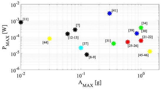 - Description: This indicator is focused on the type of vibrations that the considered MTT and the corresponding RVEH are able to exploit. In particular, the basic classification that is considered in this paper is between “SINUSOIDAL” and “NOT-SINUSOIDAL” vibrations. This is a crucial aspect from the practical point of view. Various vibration sources characterized by different harmonic contents exist in practical applications. Examples of vibration sources are walking people, moving trains or cars, and domestic or industrial working machines [84,85,86]. Sinusoidal vibrations are rarely encountered in real world applications. Even if vibrations in practical applications are usually periodic, random, or single event motions (e.g., impacts) [84,85,86], for simplicity reasons, most research papers focusing on RVEHs and in particular on MTTs deal with purely sinusoidal vibration sources.