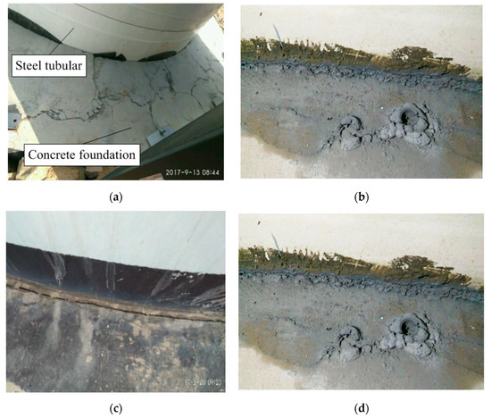 Figure 3 shows the reinforced concrete beam-slab foundation of a wind turbine, in which the steel tower is connected to the foundation by means of an embedded steel ring. Obvious gaps and cracks occurred on the top surface of the foundation pier and the steel tower swayed noticeably after the wind turbine operated for only 20 months. During the field investigation, it was found that rainwater had permeated into the gaps and cracks between the concrete foundation and the steel ring. The flow of water around the steel ring and through the holes on its wall was induced due to the pumping effect caused by the dynamic loading and then led to the leaching of the concrete and the mortar in the transition zones between the steel ring and the concrete foundation. It was also found that there were no studs welded onto the steel ring’s wall which was connected to the concrete foundation pier only through the reinforcing bars threading through the holes. The local pressure stress of the concrete on and beneath the T-shaped plate as well as on the top edge of the steel ring was relatively large. Under alternating loads, the concrete located at the interface between the steel ring and the concrete foundation pier was ground up, resulting in gradually increasing gaps between them. After drilling holes from the top surface of the foundation pier to the area above the T-shaped plate, cracks were observed on the lateral walls of the holes using an endoscope, as shown in