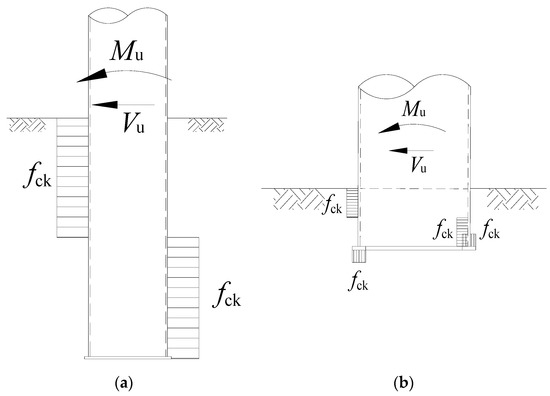 D is the diameter of the circular cross-section. The edge stress in the tension zone of the foundation pier can be determined according to Equation (2) for meeting the first-level cracking control requirements in the Code for Design of Concrete Structures (GB50010-2010) [